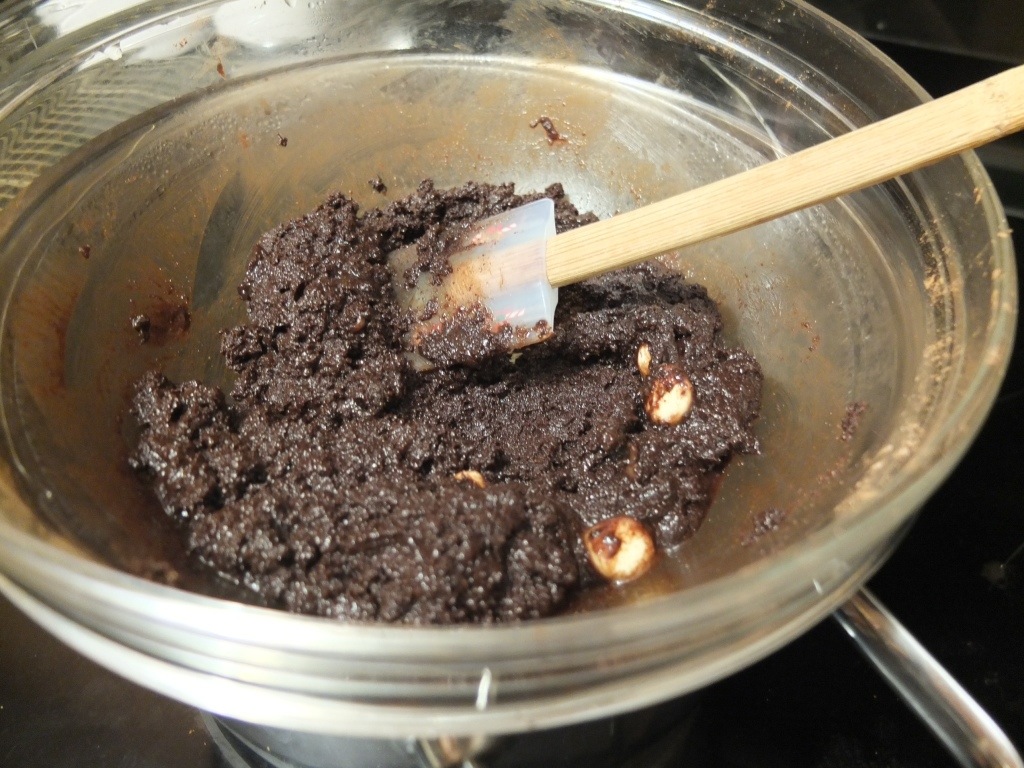 3. Whisk the flour with the sugar, soda, cinnamon, cardamom, salt, cloves, and pepper. Stir in the applesauce, eggs, oil and butter. Fold in the chocolate chips.
