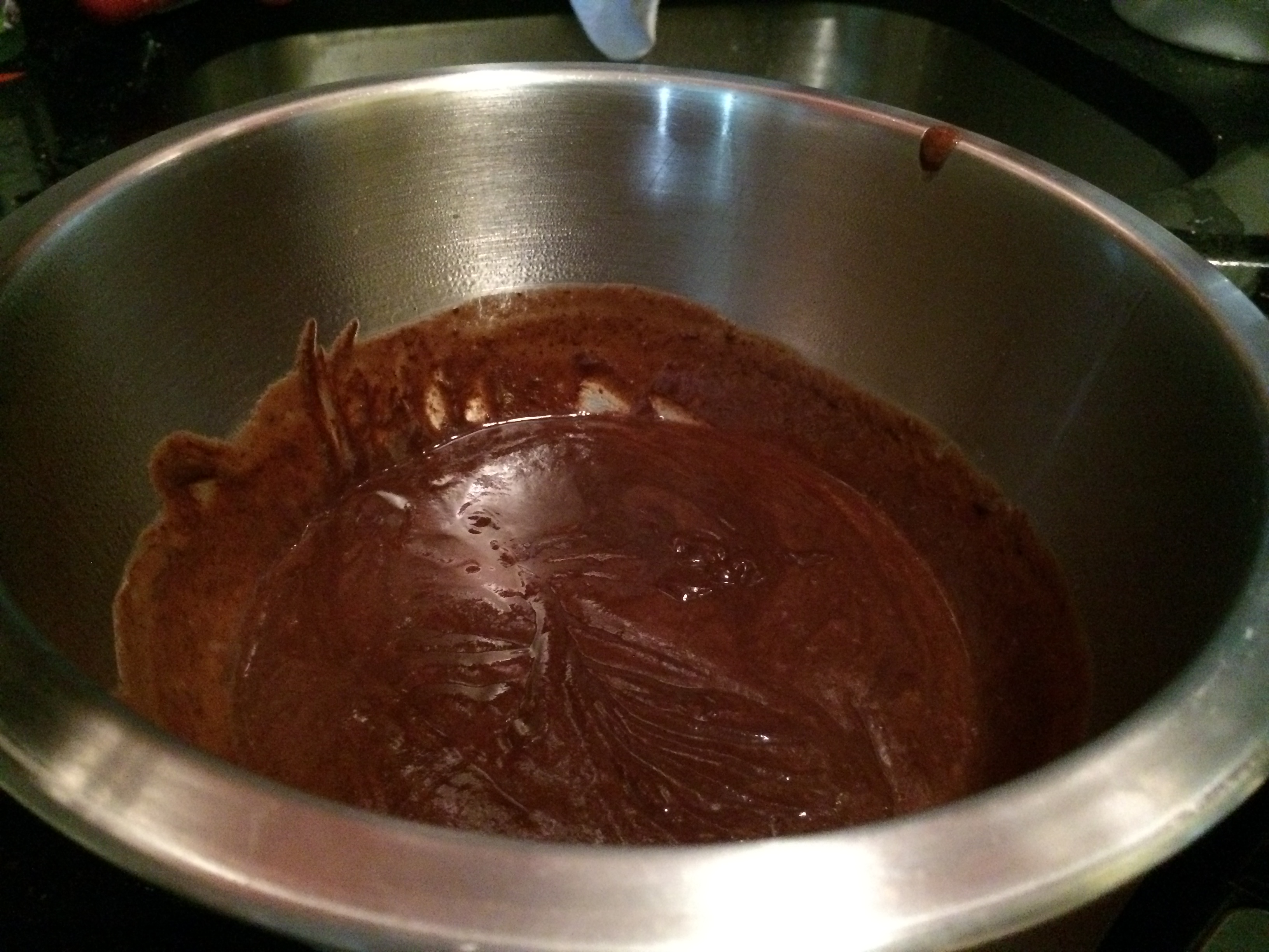 Strain the chocolate mixture to remove any cooked eggs (it happens!) into a bowl that has been chilled.