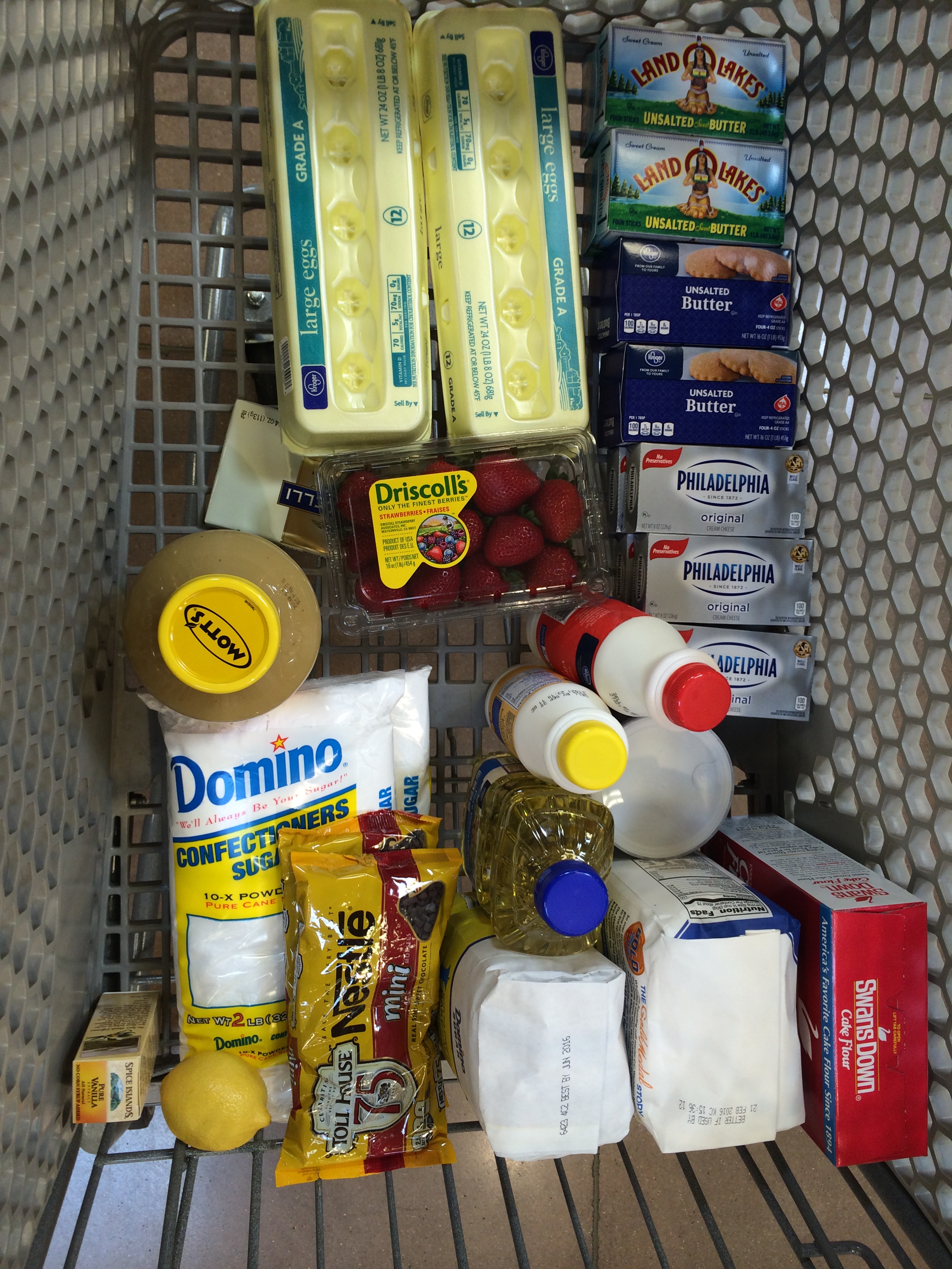 I had made the main cake for a birthday party, and the bride and groom requested it specifically: a lemon infused white cake with strawberries and a white chocolate icing in between the layers. The whole cake was supposed to be covered in the white chocolate icing, but the night before when the icing wasn’t coming out like I wanted, I made a last second decision to still use the icing for the filling between the layers but made a cream cheese icing to cover the cake. Everyone loves cream cheese icing (unless you are crazy), so I knew it would work out.