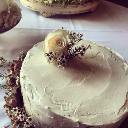 The wedding was outdoors and the bride had her hand in everything, making it a beautiful, vintage-y wedding where my cake could fit in. I told them that two levels was my max, but that I’d be willing to make multiple cakes, and they were completely flexible with me. The florist provided the flowers to decorate the cake, so all I had to do was bring three white cakes. Simple really.