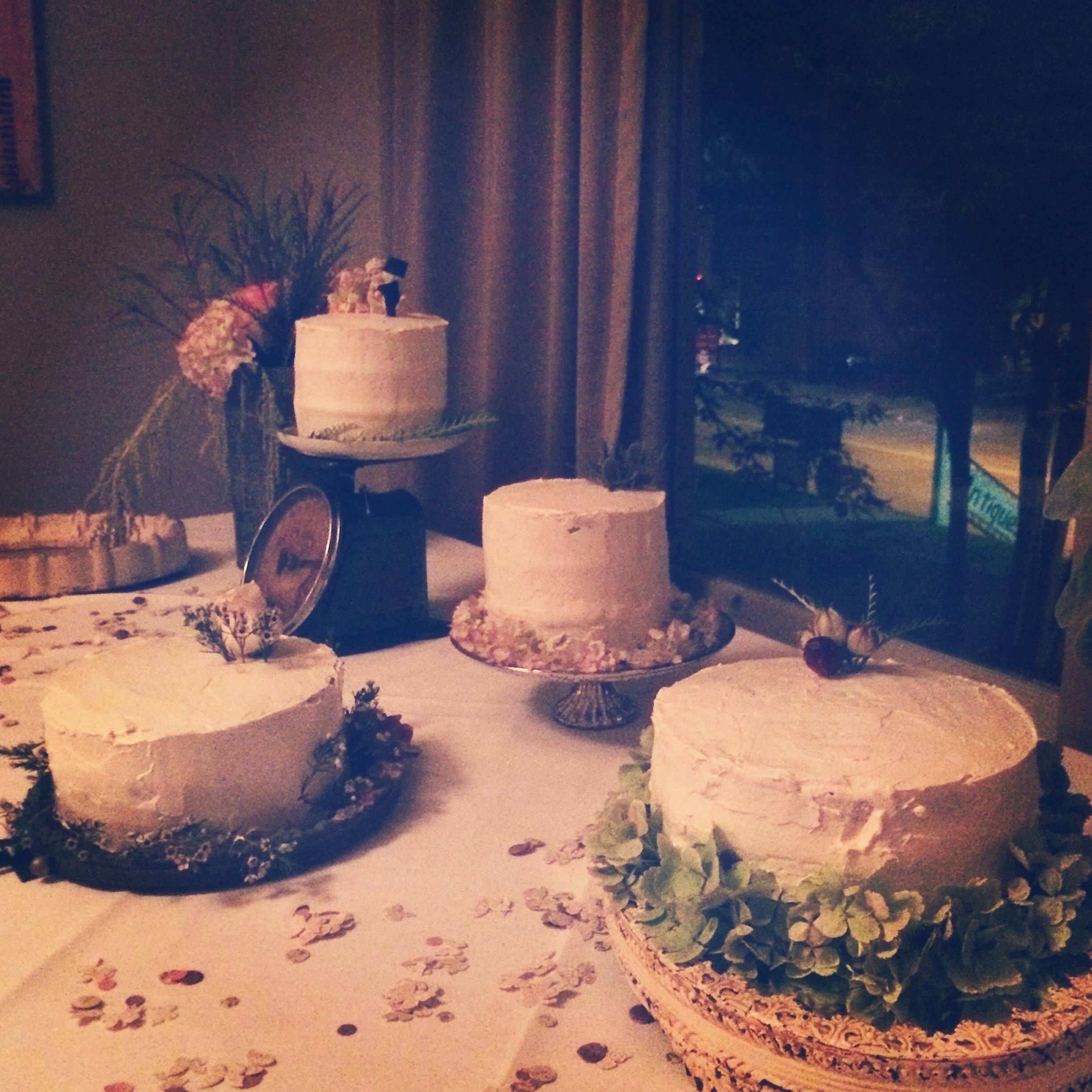 All credit for how beautiful the cakes look go to Paige for picking out awesome cake stands and for her friend Rebecca for doing the flowers. I just delivered white cakes.