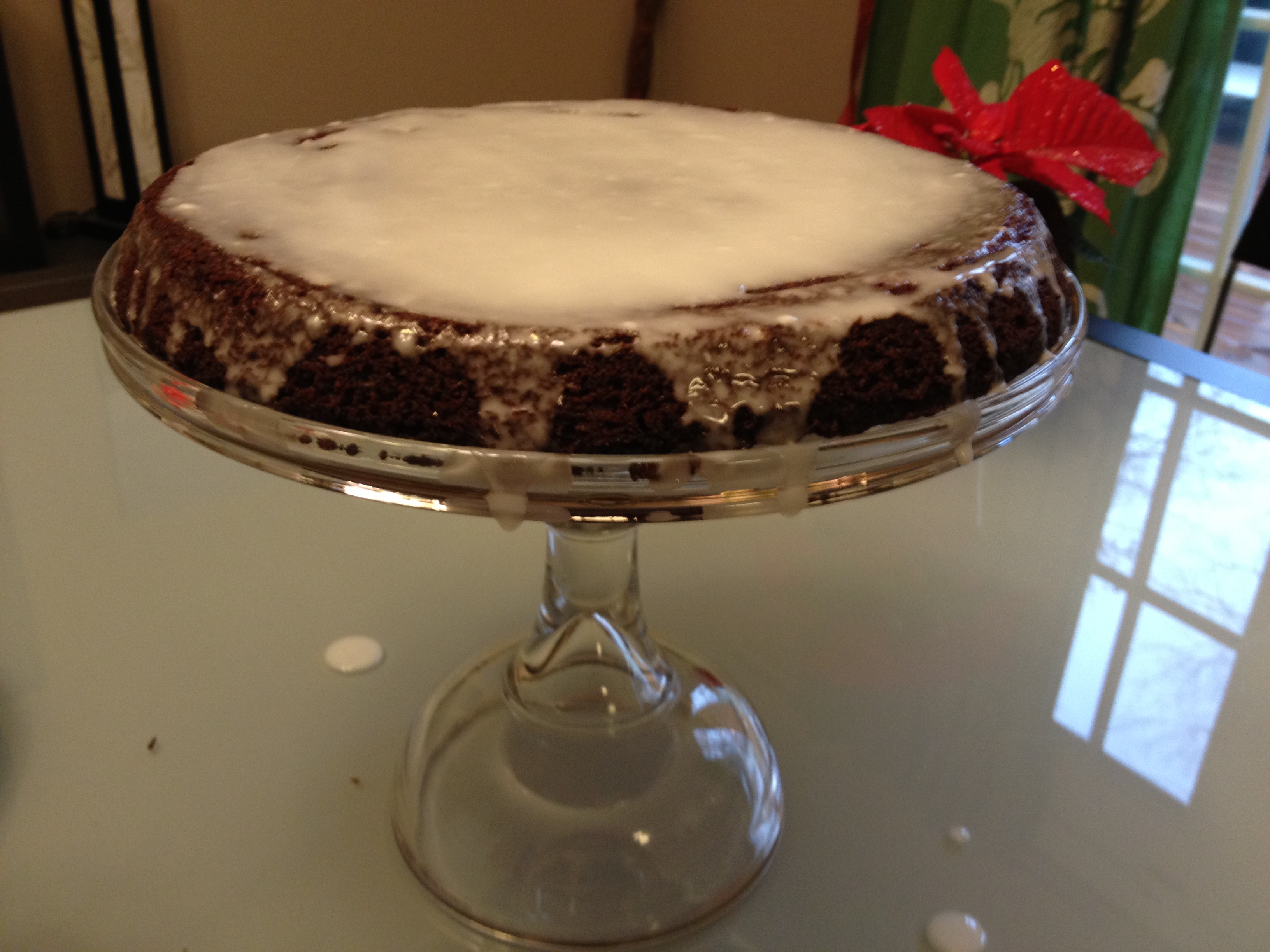When brownie is done, allow to cool slightly, then flip onto a serving dish.  Drizzle with icing.