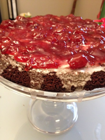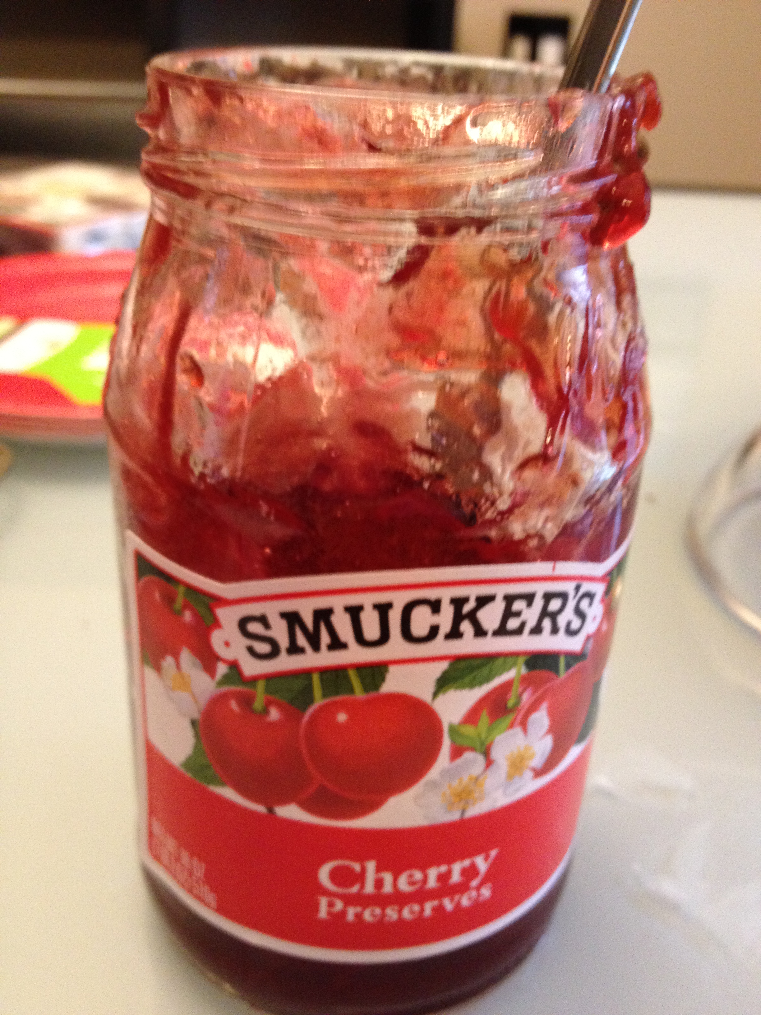 Finally, top with 3/4 of a jar of Pillsbury Cherry Preserves.