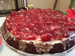 Then I decided I would combine an almond flavored brownie, an almond glaze, and cherry preserves.  Once I had that decided, I just needed to settle on the presentation of the dessert. Bite size brownies?  Cherries in between two layers of brownies?  Cherries below or above the almond glaze? My classmates were forced to test out a different version every couple of weeks.  Finally, I decided on a brownie cooked in a pie pan with the almond glaze topped by cherries; served like a cake.