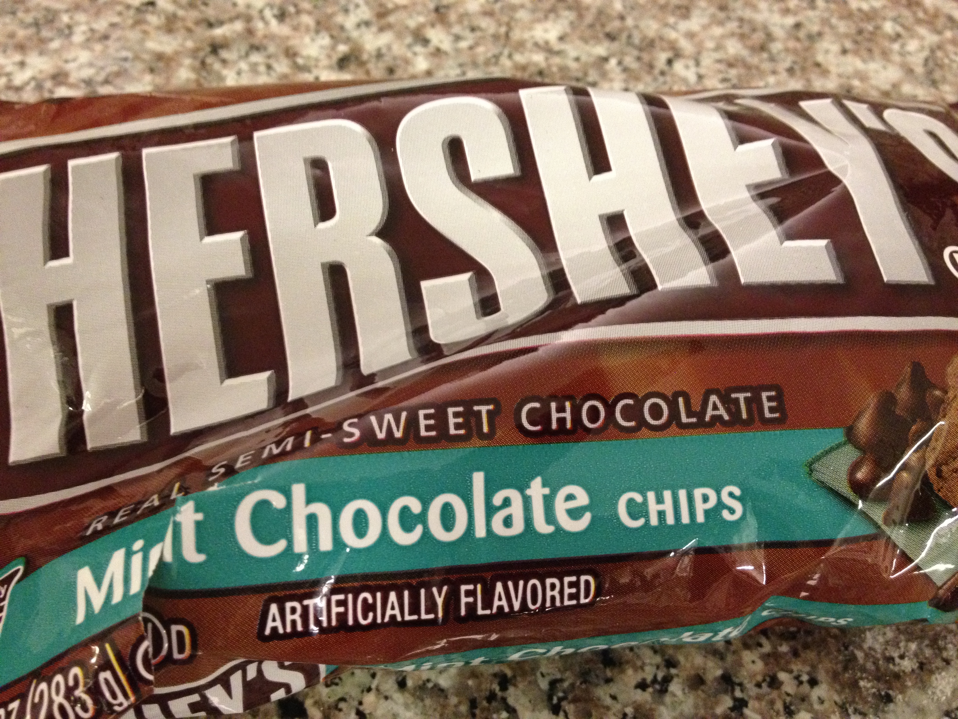 After making them for the first time (and thinking about them for a while afterward), I decided I want to try them with a mint flavor.  My original idea was to add peppermint extract to the dough instead of vanilla.  Then I ran across some mint chips on display at the end of the aisle at the grocery store and settled with them. (Hey!  One of my classmates studies the effect of end of the aisle displays – here is an application.)